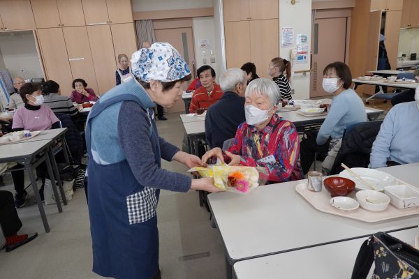 2月の「二十日会」はひと足先に春を呼ぶ「ちらし寿司」でした。この日は新しいお友達も迎えて、お誕生月の方には花束も贈られ、みんなで祝いました。立春を過ぎたとはいえ、まだ風が冷たい日でしたが家庭の主婦が真心こめて作った「ちらし寿司」をいただき、会場は暖かい雰囲気に包まれていました。