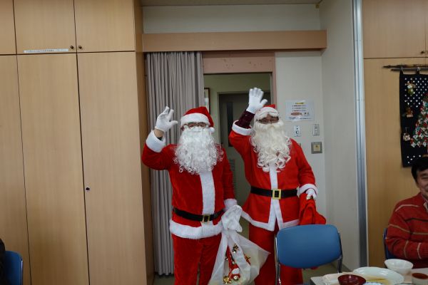 12月の二十日会に、ひと足はやくサンタクロースがやってきました。今月のメニュー「おでん」をいただいて温まったところにふたりのサンタさんが現れました。サンタさんはひとり一人に「クリスマスおめでとう」と声をかけながら、大きな袋からプレゼントを出して渡していました。利用者のみなさんは「いくつになってもプレゼントは嬉しいね」と喜んでおられました。