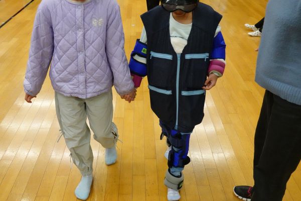 児童は手足や身体(ベスト)に重りを身につけ、見えにくい眼鏡(ゴーグル)を掛けて高齢者疑似状態にして歩いたりステップを上り下りしたり、その人の介添えをしたりして高齢者になると身体が不自由になることと介添えが大事なことを体験学習しました。